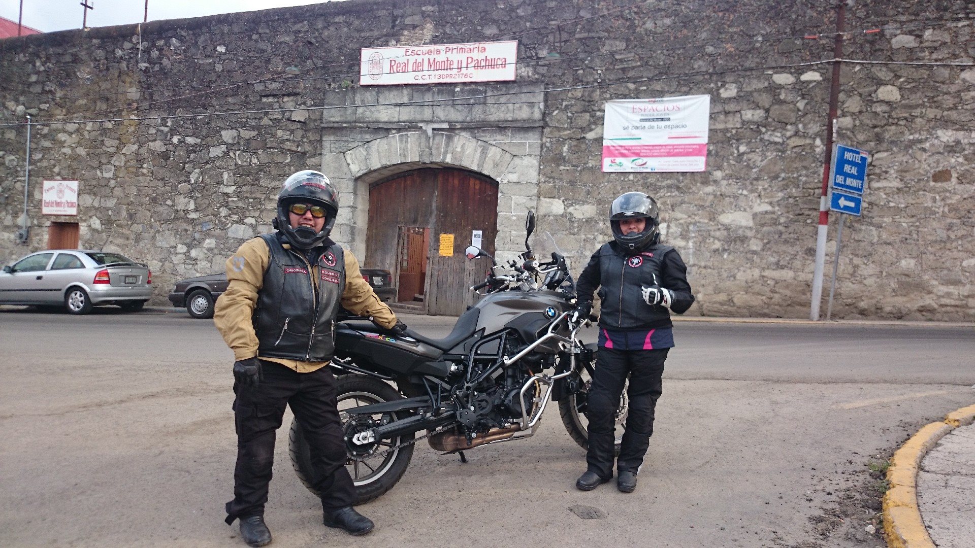 En Real del Monte con las motos atrás y sin casco atrás de los portales nos estacionamos para ir por unos pastes.