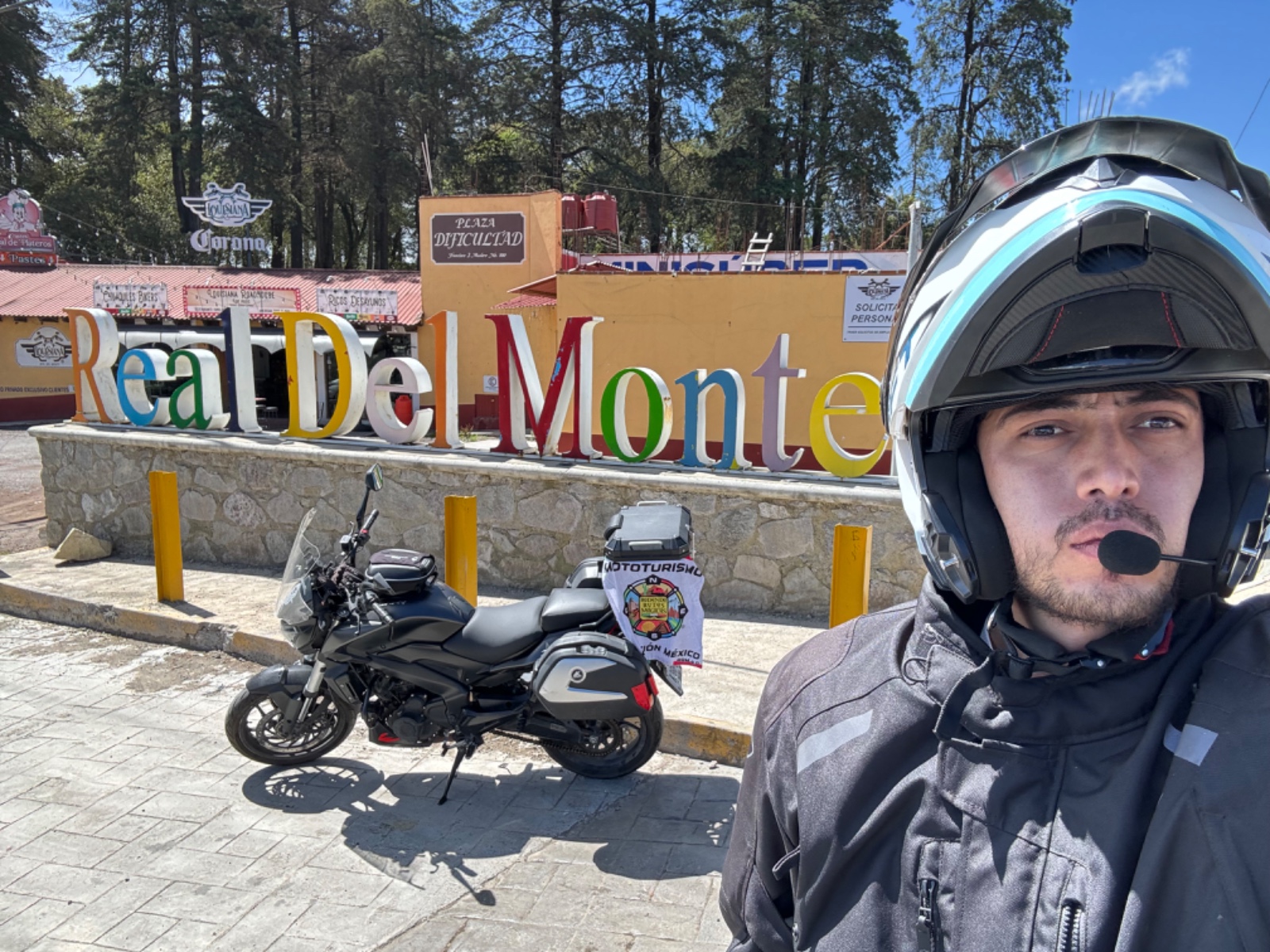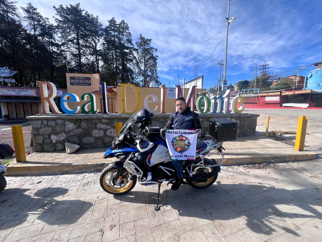Fotografía tomada frente a la iglesia donde se aprecia la plazoleta donde se encuentra la fuente y al fondo las letras de Real del Monte. moto, bandera, lugar y yo.
